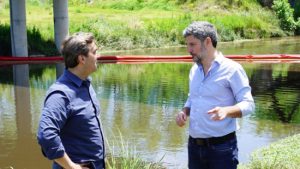 Durante la visita de trabajo al municipio, Germán Ciucci, y el intendente Boto, también realizaron una recorrida para supervisar la barrera sanitaria colocada en Olivera, intervención que permite la retención de residuos sólidos flotantes para su posterior extracción del cauce.