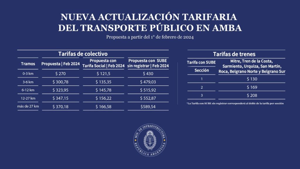 A través de la resolución 01/2024, la Secretaría de Transporte, dependiente del Ministerio de Infraestructura, publicó los valores máximos propuestos para el cuadro tarifario del transporte público de pasajeros en el Área Metropolitana, con vigencia al 1° de febrero.