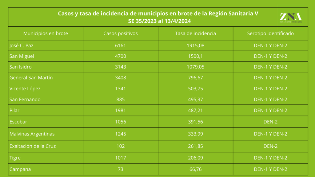 Los municipios con mayores tasas de incidencia de la región sanitaria V son José C. Paz, San Miguel, San Isidro, General San Martín, Vicente López y San Fernando.