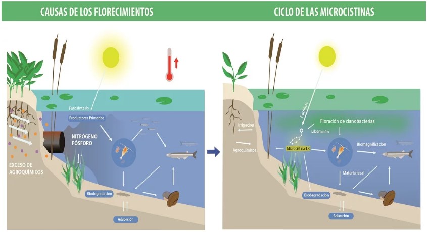 Si bien estos organismos están presentes naturalmente en todos los cuerpos de agua, su aparición se ve intensificada en los momentos de floración, en los cuales presentan un exceso de nutrientes como nitrógeno y fósforo. “Muchas veces esto sucede por el crecimiento poblacional que acrecienta la descarga de efluentes cloacales o desechos domiciliarios, por el aumento de temperatura como consecuencia del cambio climático que acelera el proceso, así como otro gran factor es el uso de fertilizantes y agroquímicos que terminan vertidos en el agua”, detalló el bioquímico.