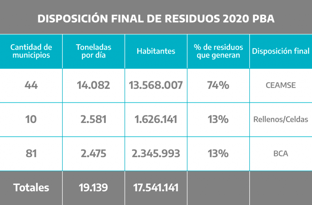 El siguiente cuadro nos muestra el detalle de la disposición final de residuos en los 135 municipios de la PBA para el año 2020: