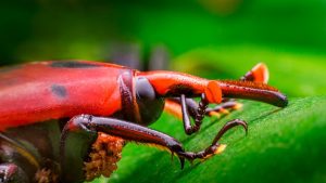 El insecto es fácilmente reconocible por su tamaño (hasta 5 cm), su color rojizo o anaranjado con manchas negras y un pico largo y delgado.