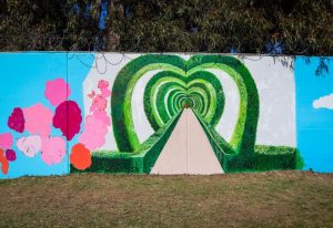 Justo enfrente al mirador, en un paredón de más de 60 metros, la empresa de indumentaria Kosiuko realiza una intervención artística. Con una temática que representa el amor, pintan un mural que se divide en siete paneles con distintos diseños que muestran ángeles en el centro de la escena y a su alrededor corazones y rosas.