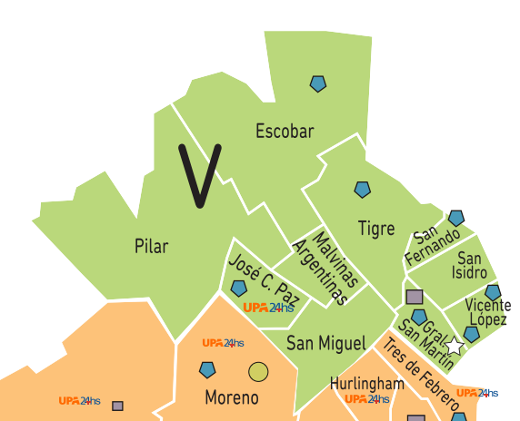 La Región Sanitaria V abarca a los municipios de José C. Paz, Escobar, San Martín, Tigre, Vicente López, San Fernando, Pilar, Malvinas Argentinas, San Miguel y San Isidro.