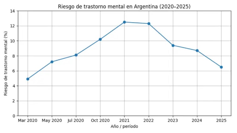 De acuerdo al estudio, el 6,5% de los argentinos tienen riesgo de padecer un trastorno mental. En 2020, el porcentaje era 4,9% (alcanzando un máximo de 12,51% durante ese año, es decir, durante la fase más aguda de la pandemia).